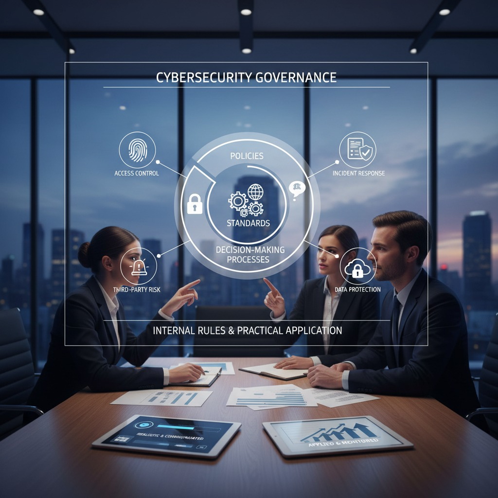 Policies, standards, and decision-making processes also play a central role in cybersecurity governance. Organizations need clear internal rules that define expectations for areas such as access control, incident response, third-party risk, data protection, and acceptable use. However, documentation alone is not enough. These rules must be realistic, communicated effectively, and supported by processes that allow them to be applied and monitored in practice.